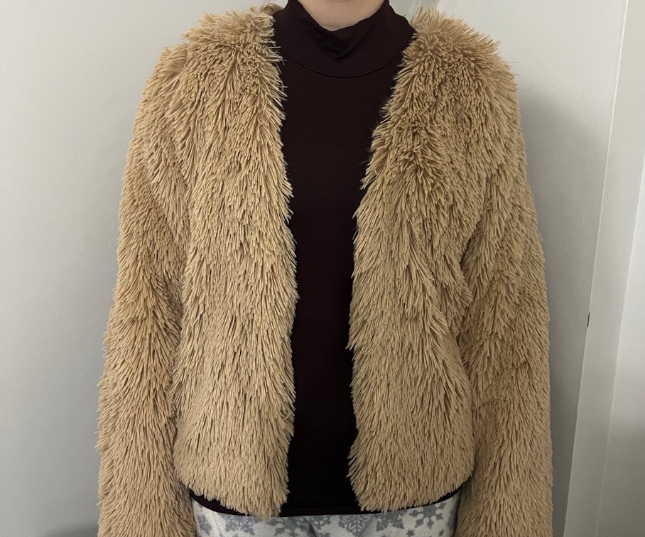 Bej renkli, midi boy, uzun kollu, yün kumaştan yapılmış, suni kürk detaylı, normal kesim kadın ceketi.