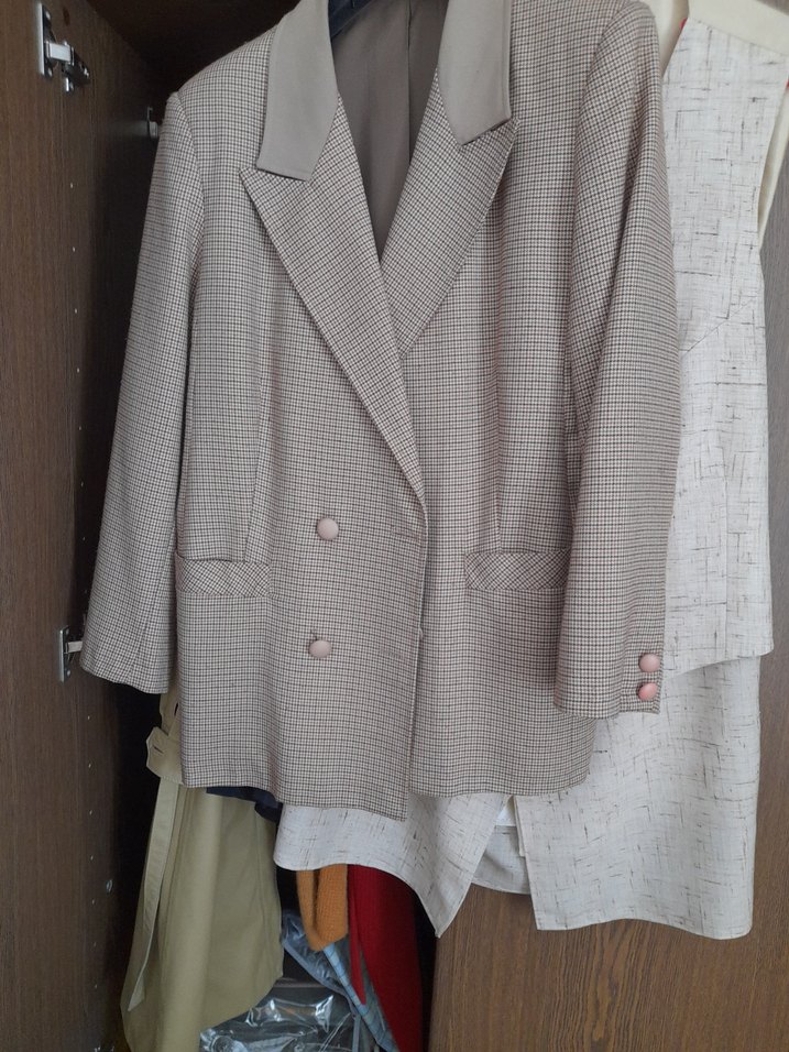 Bej midi kadın takım ceketi, düğmeli ve kırmalı yaka detaylıdır. Yumuşak keten kumaştan, normal kesim ve uzun kolludur, ofis için uygundur.