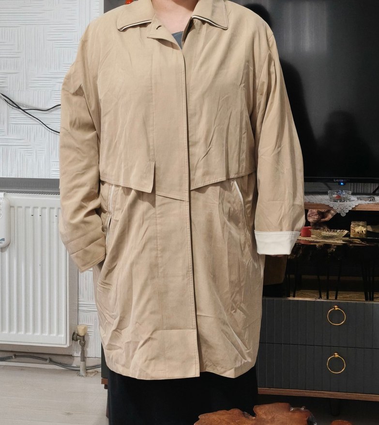 Bej renkli, keten kumaştan midi uzunlukta, bol kesim kadın trençkot. Uzun kollu, yakası cepli ve düğmeli, günlük sokak stili için uygun.