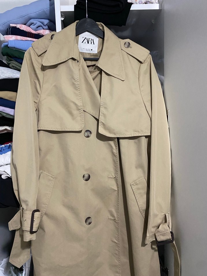 Bej renkte, düğmeli, normal uzunlukta midi trençkot. Notlu yaka ve uzun kollu, sentetik kumaştan yapılmış, rahat kesim. Ürünü bir kere giydim yıkayıp kaldırmıştım almak isteyen hayırlı olsun