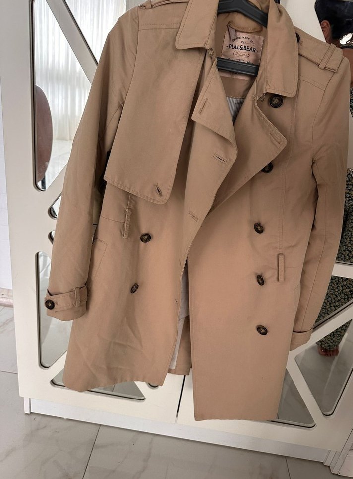 Bej midi uzunlukta, düğmeli, kesik yaka trençkot. Sentetik kumaştan, uzun kollu ve rahat kesim, günlük sokak tarzı için uygun. Bedenime küçük geldi mağazadan aldım ama hiç giyinemedim. dolabımda duruyor elden çıkarmak istiyorum bu yüzden bu fiyat