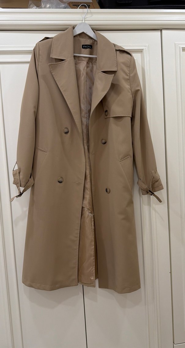 Bej midi uzunlukta, düğmeli, yakalı kadın trençkot. Uzun kollu ve rahat kesim, günlük kullanıma uygundur.
