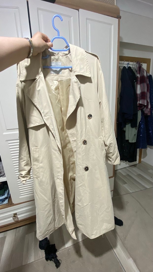Bej midi uzunlukta, düğmeli ve bol kesim kadın trençkot. Sentetik kumaştan, uzun kollu ve yakası kesik detaylıdır. 1 kere bile giyilmedi