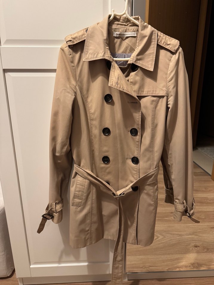 Bej midi uzunlukta, düğmeli, uzun kollu kadın trençkot. Sentetik kumaştan, regular fit, günlük ve sokak stili için uygun, kemerli ve desensiz tasarım.