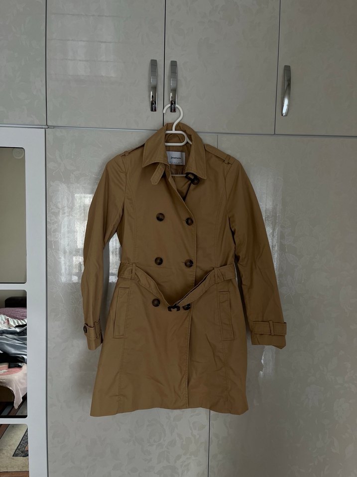Bej midi uzunlukta, kemerli ve kesik yaka detaylı kadın trençkot. Uzun kollu, rahat kesim ve günlük kullanıma uygun. Sentetik kumaştan üretilmiştir.
