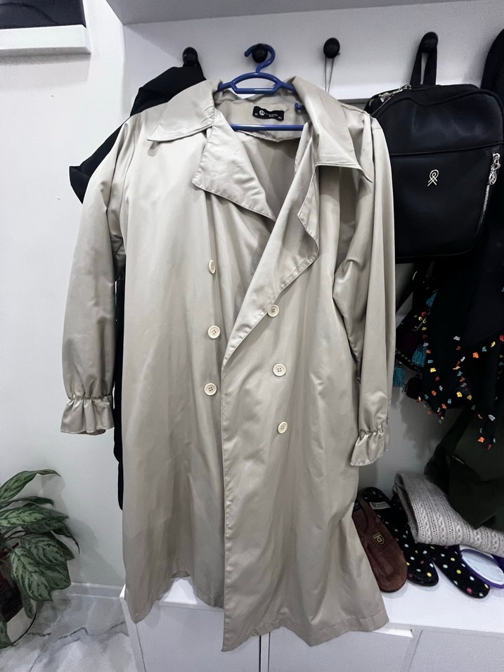 Uzun kollu, düğmeli bej trençkot, notched yaka ve bol kesim. Sentetik kumaştan, günlük sokak stili için uygun.
