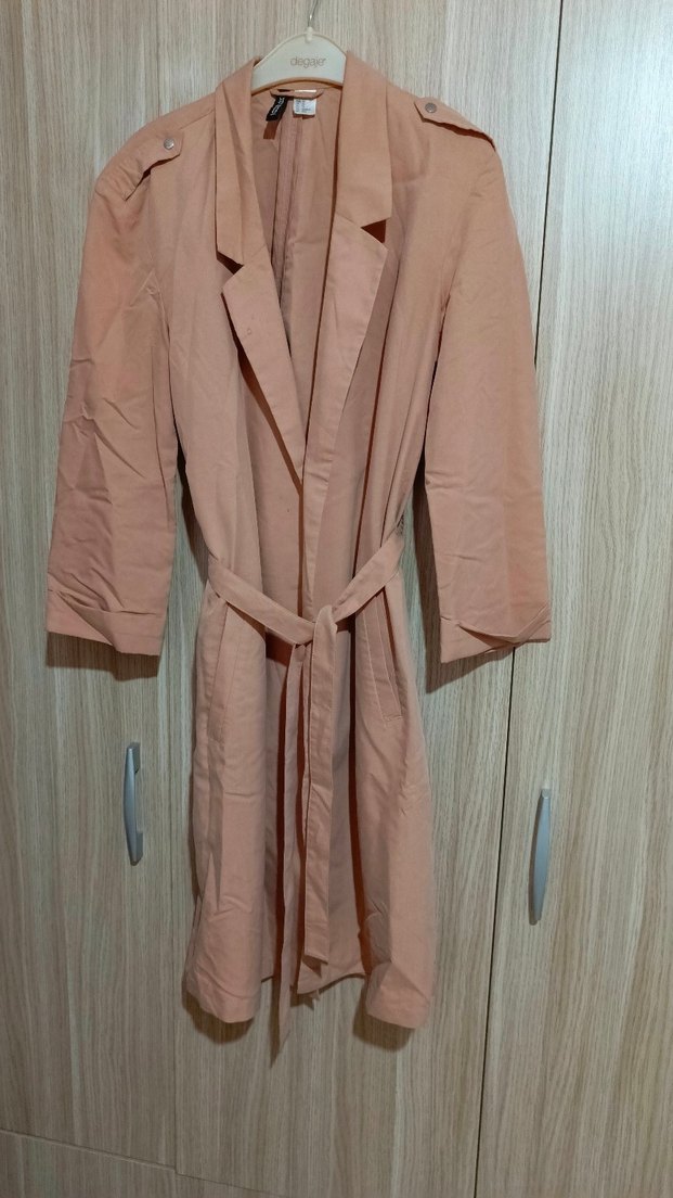 Bej renkli midi uzunlukta trençkot, yakasında kesimli yaka ve düğmeli kapama bulunur. İnce ve hafif kumaştan, uzun kollu ve kemerli, minimalist tarzda günlük kullanıma uygundur.