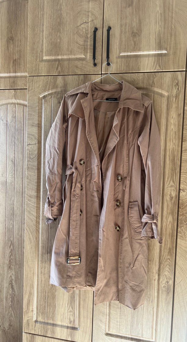 Bej renk midi uzunlukta kadın trençkot. Düğmeli, uzun kollu ve yakası notched lapel. Rahat kalıp ve kemer detaylıdır.