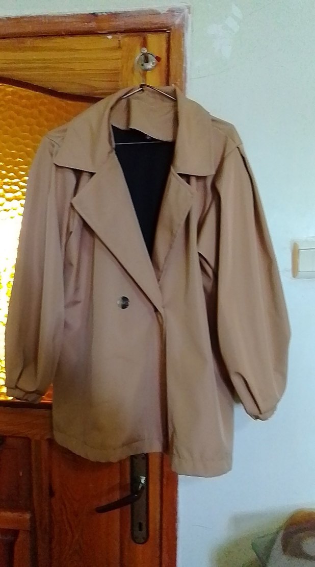 Bej renkli, bol kesim midi trençkot, yakası kesik ve düğmeli. Yumuşak sentetik kumaştan, günlük rahat sokak stili için uygun. Uzun kollu, desensiz tasarım.