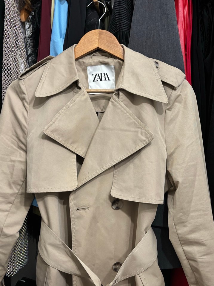 Bej midi uzunlukta, çift düğmeli, notlu yaka ve uzun kollu kadın trençkot, rahat ve şık bir görünüm sunar. Etiketini malesef atmıştım fakat hiç giyilmedi. Hiçbir kusuru yoktur.