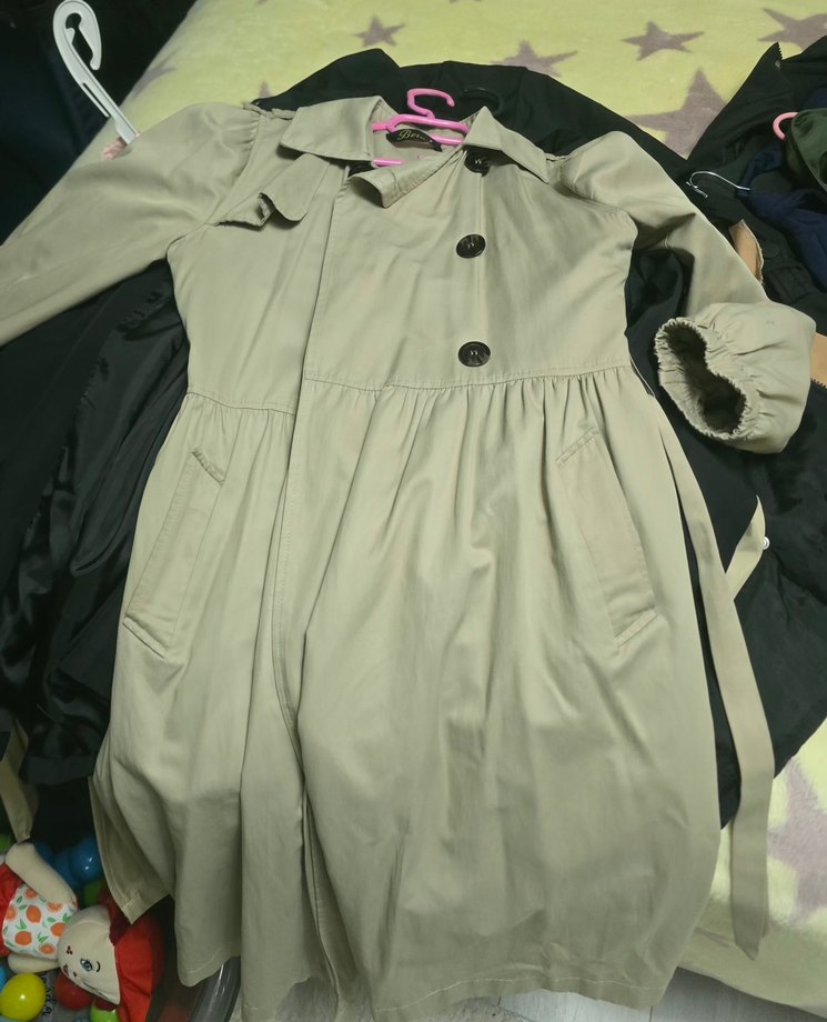 Bej renkli, düğmeli, midi boy kadın trençkot, sentetik kumaştan, uzun kollu ve salaş kesimlidir. Günlük rahat kullanım için uygundur.