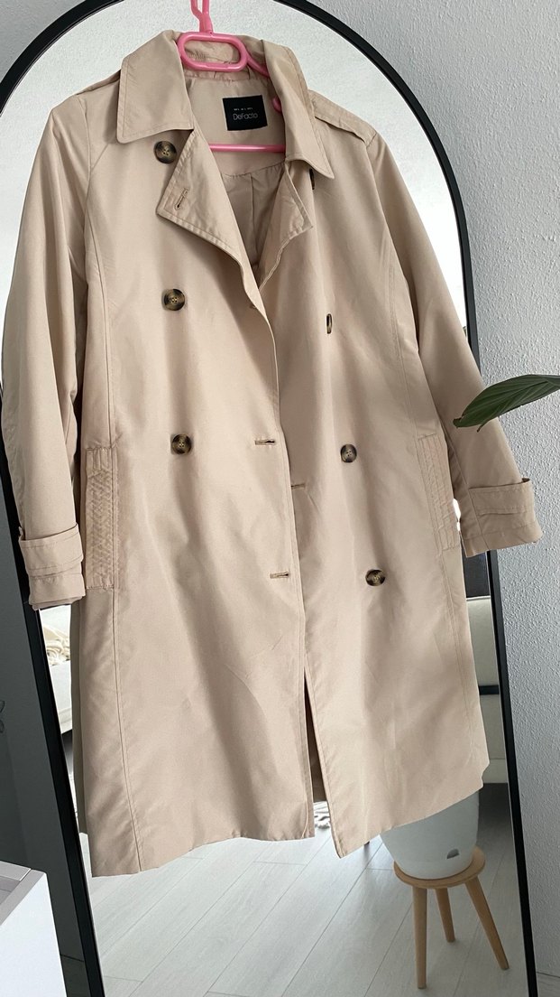 Bej midi uzunlukta, düğmeli, uzun kollu ve normal kesim kadın trençkotu. Sentetik kumaştan, sokak tarzı için uygun.