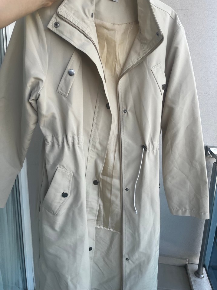 Düğmeli ve cep detaylı, bej midi kadın trençkot. Notlu yakalı, uzun kollu, sentetik kumaştan, günlük sokak stili için ideal.