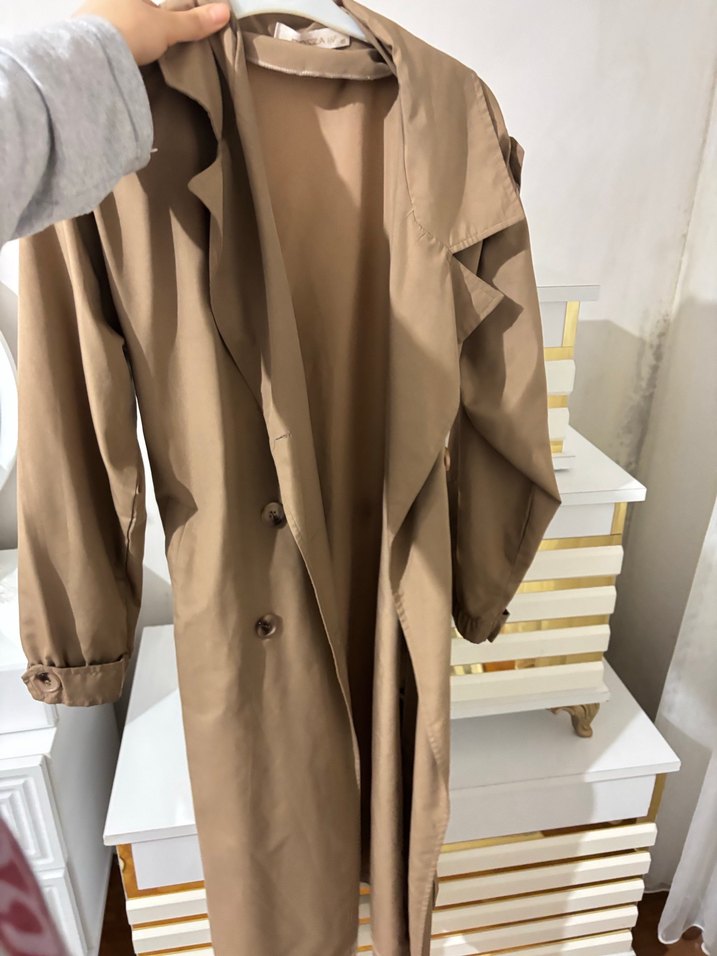 Bej midi uzunlukta, düğmeli ve cepli kadın trençkotu. Uzun kollu, geniş kesim ve yumuşak sentetik kumaştan üretilmiştir.