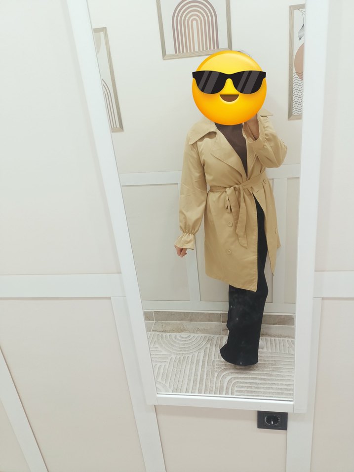 Bej renkte, düğmeli ve salaş kesim midi trençkot. Uzun kollu, keskin yaka detaylı, sade ve günlük kullanıma uygun. görselde belirttiğim kolunda fırfır kısmında iplerin sökülmesinden kaynaklı deforme var terzide yaptırılıp giyilebilir onun harici sıkıntısi yok