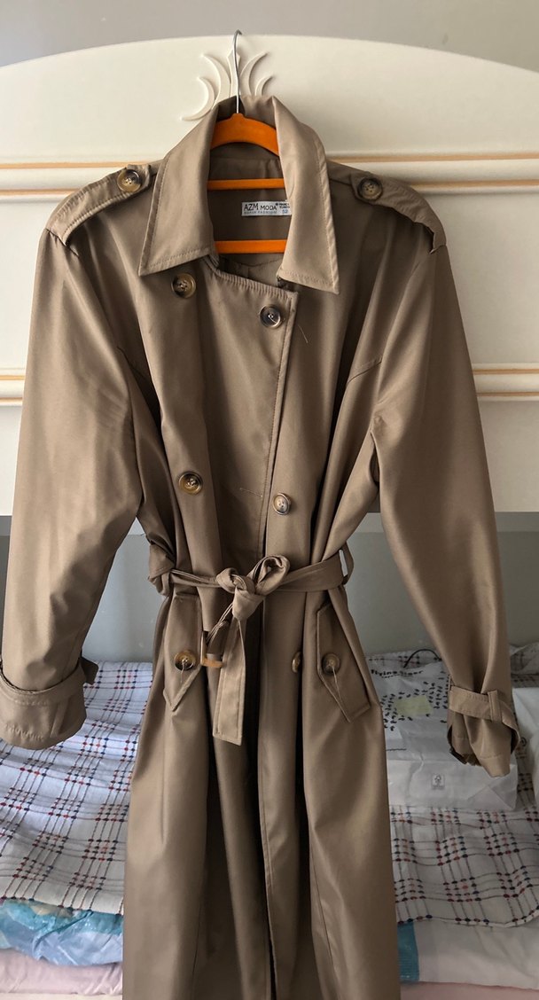 Düğmeli, salaş kesim bej midi trençkot. Sentetik kumaştan, uzun kollu ve kuşaklı, günlük sokak stili için uygun.