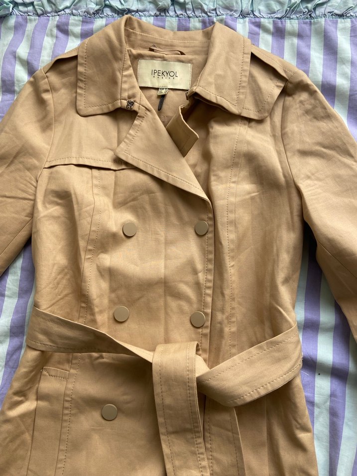 Bej midi uzunlukta kadın trençkot, düğmeli ve kesik yakalı. Sentetik kumaştan, regular fit ve askılı kollu, şık ve rahat bir ofis kombini için uygun. Marka: İPEKYOL.