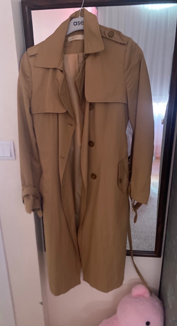 Bej midi uzun kollu trençkot, kemerli ve klasik Paris tarzı. Sentetik kumaştan, günlük şıklık için idealdir.