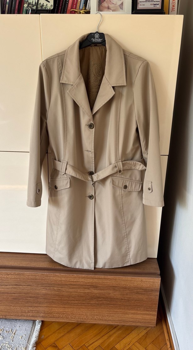 Bej midi uzunlukta kadın trençkot, kesik yaka ve kuşaklı bel detayına sahip. Uzun kollu, düz desenli ve rahat kesimdir. Günlük sokak stili için uygundur. Bedeni 5 beden olarak geçmektedir.
