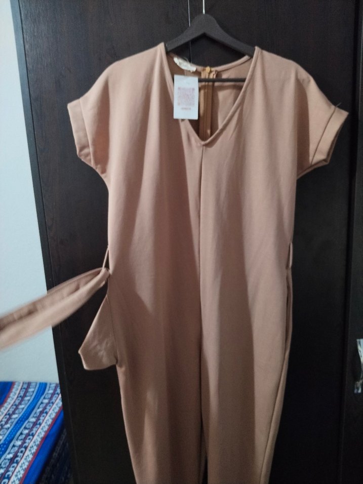 Bej midi uzunlukta, kısa kollu ve V yakalı, rahat kesimli kadın tulum. Minimalist ve şık sokak stili için uygun, sentetik kumaştan yapılmıştır.
