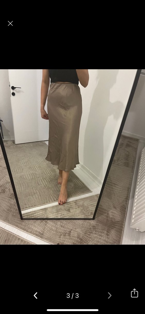 Bej renkli midi uzunlukta, bol kesim ve ipeksi dokulu etek. Minimalist normcore tarzıyla günlük kullanıma uygun, zahmetsiz şıklık sunar.