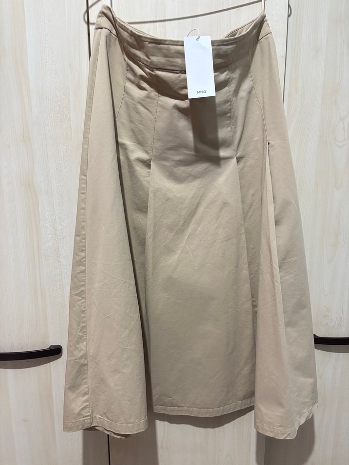 Bej midi uzun etek, bol kesim ve düz sentetik kumaştan, minimal ve rahat bir tarz sunar, günlük kullanıma uygundur.