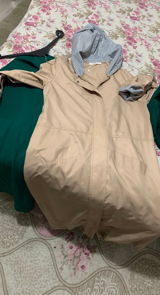 Uzun kollu, düğmeli bej midi kadın yağmurluğu. Salaş kesim ve çizgili kapüşon astarı ile günlük sokak stiline uygun. ️