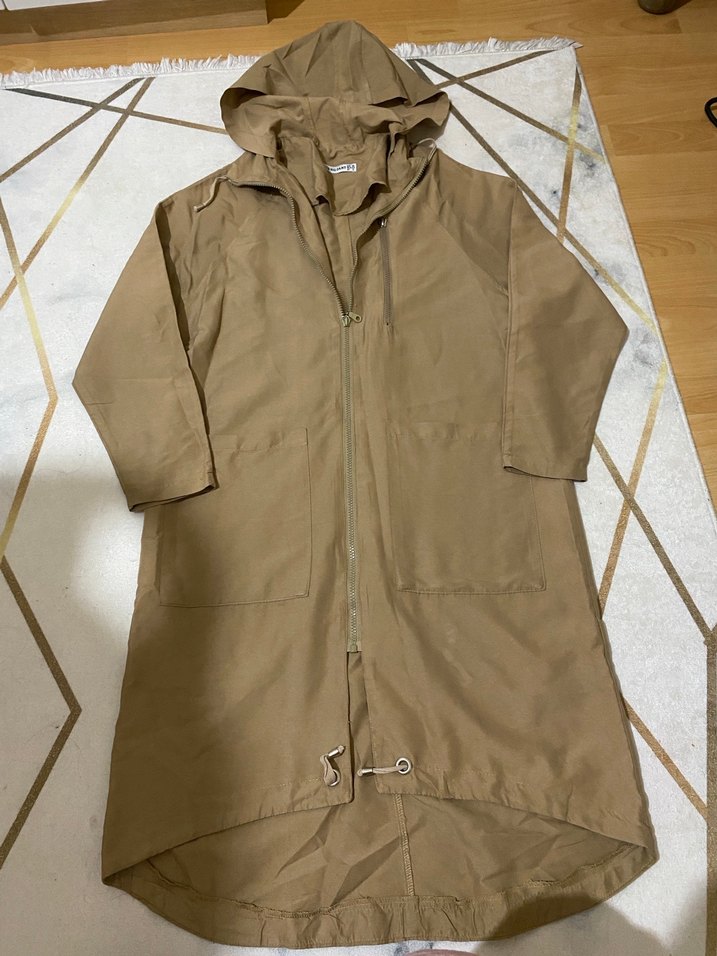 Bej midi boy kadın yağmurluk, kapüşonlu ve notched lapel yaka detaylıdır. Uzun kollu ve bol kesim olup parlak sentetik kumaştan yapılmıştır. Günlük kullanıma uygundur. ☔