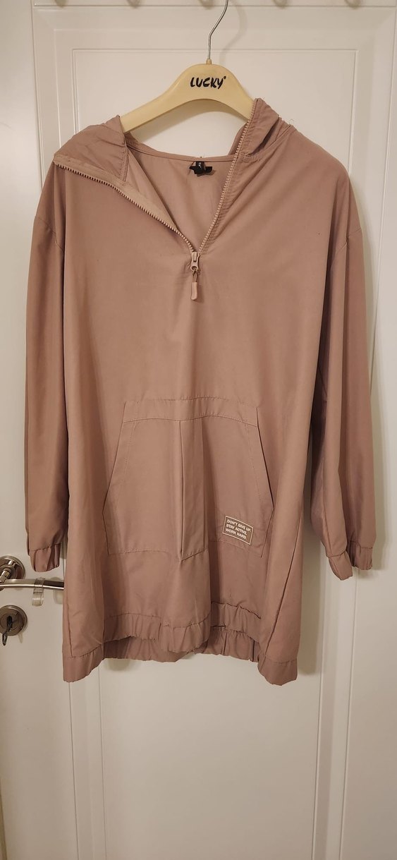 Bej renkli midi uzunlukta yağmurluk, yüksek yakalı ve uzun kolludur. Rahat kesimi ve yumuşak keten kumaşı ile önünde fermuarlı ve kanguru cepli, günlük kullanıma uygundur. ️