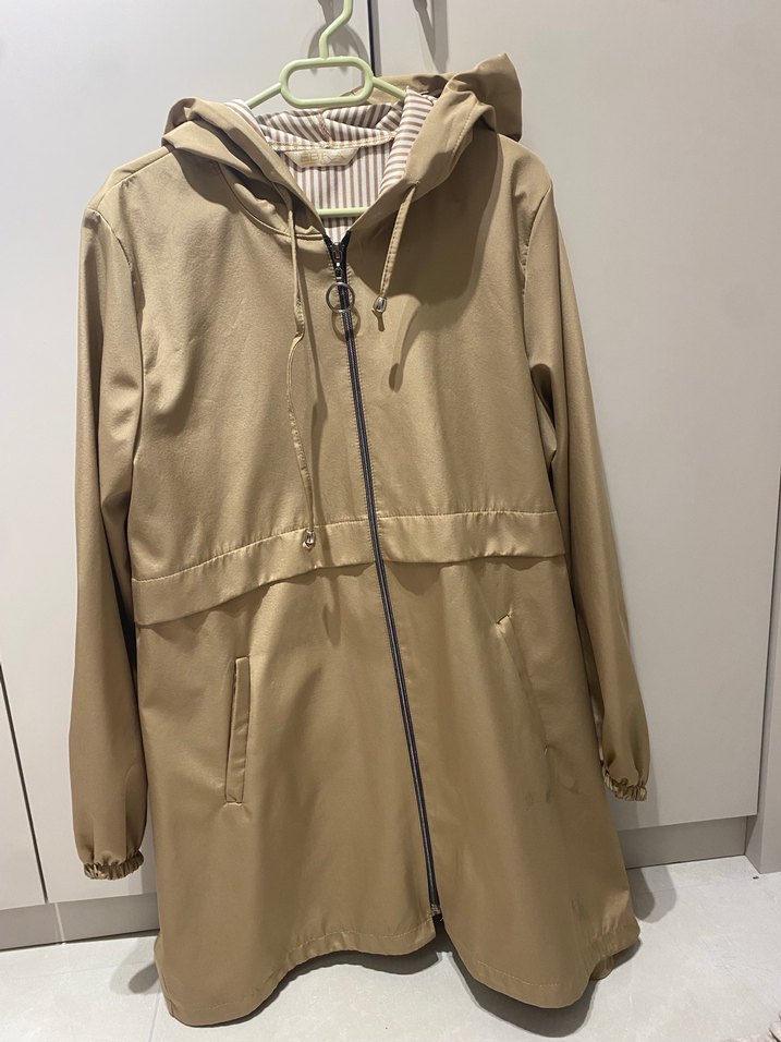 Parlak bej renkte, kapüşonlu ve fermuarlı midi yağmurluk. Uzun kollu, bol kesim, günlük sokak stili için uygundur.42 beden ama ben normade 38 giyiyorum. İyi duruyo