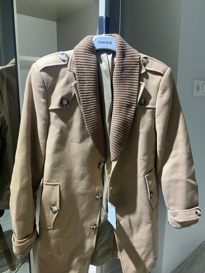 Bej renk, düğmeli, yün midi kaban. Uzun kollu, normal kesim ve Paris sokak stilini yansıtan gri örgü detaylı yakaya sahip. Günlük kullanıma uygun.
