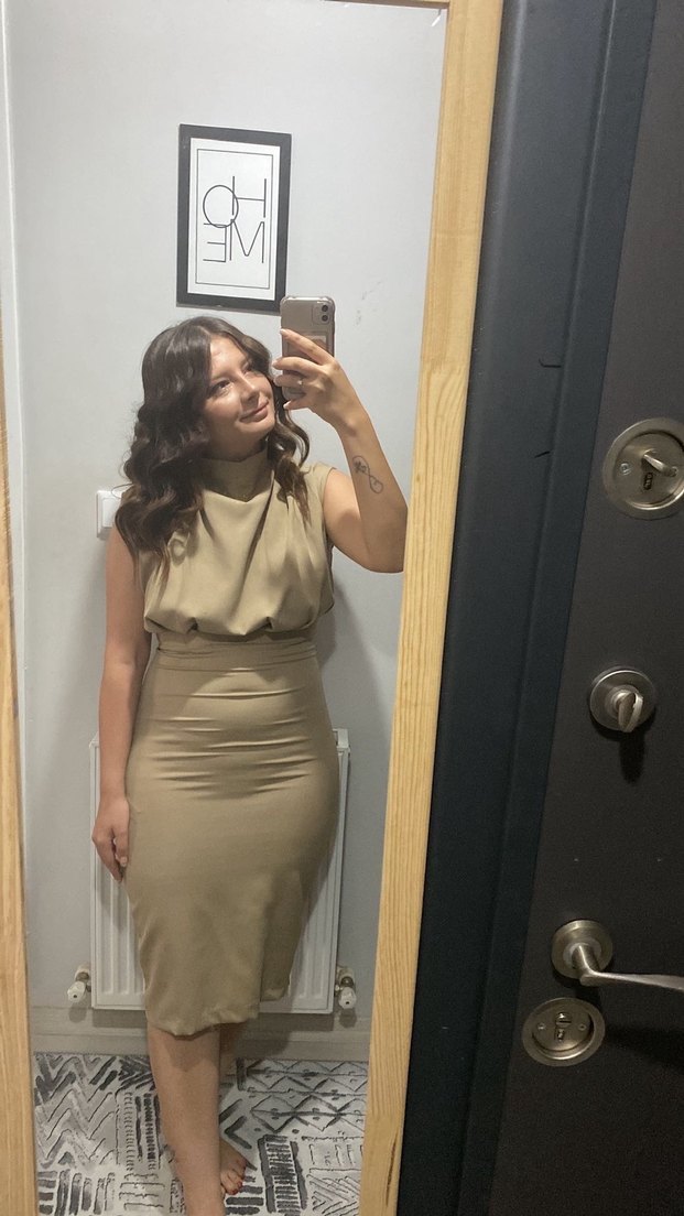 Bej renkte, yüksek yakalı ve kolsuz midi kalem elbise. İpeksi dokusuyla rahat bir kullanım sunar, ofis için şık ve sade bir tercihtir.