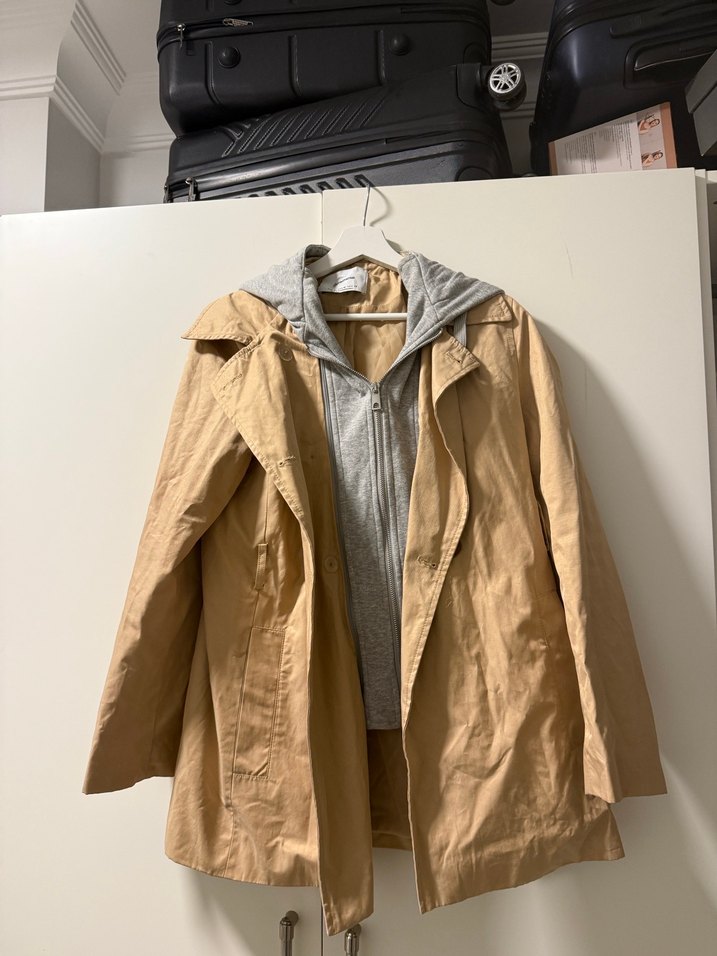 Bej midi uzunlukta kapüşon detaylı trençkot, bol kesim ve kesik yaka detaylı. Uzun kollu, minimal sokak stili, günlük kullanıma uygun.