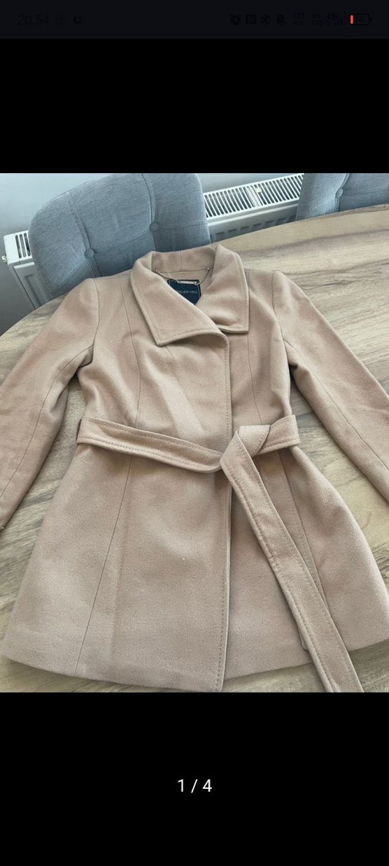 Bej renkte, kemerli ve normal boy midi kadın kaban. Yumuşak ve sıcak kumaştan, uzun kollu, yakası kesik ve rahat kesimlidir. s m uyumludur