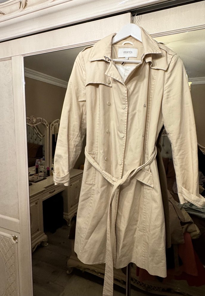 Bej midi boy, kemerli kadın trençkot. Parlak pamuk kumaştan, uzun kollu ve regular fit, Paris tarzı sokak modasına uygun.