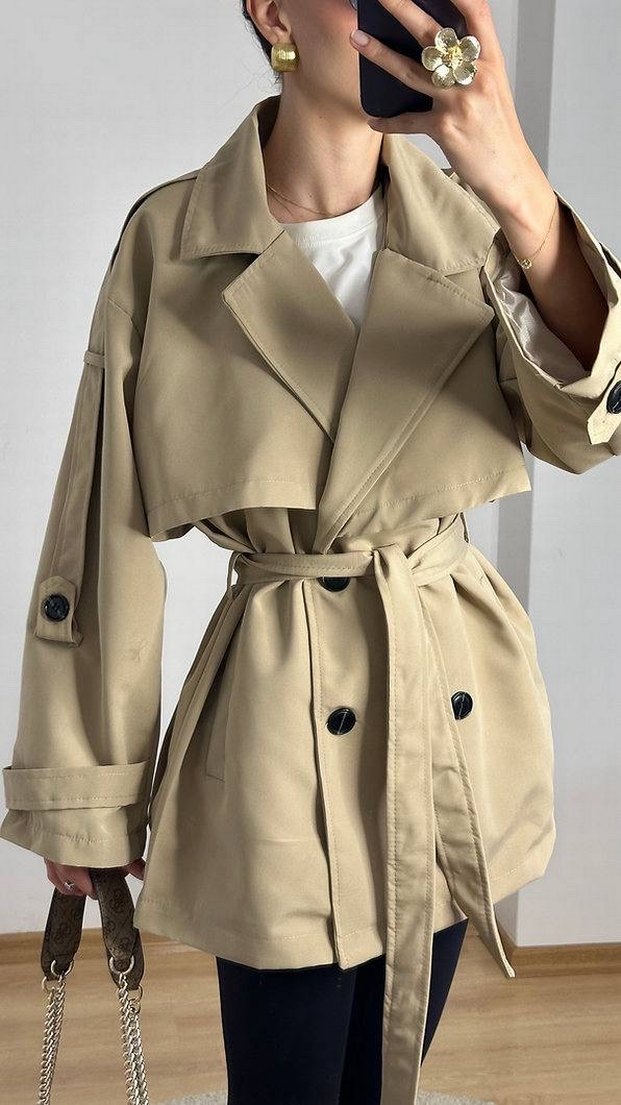 Bej midi boy kemerli trençkot, notalı yaka ve bol kesim. Askılı kollu, yumuşak sentetik kumaştan günlük kullanıma uygun.