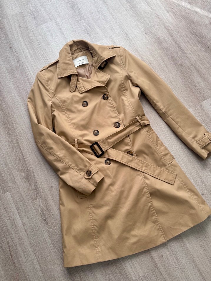 Bej midi boy, kemerli, kesik yaka kadın trençkot. Uzun kollu ve düz kesim, yumuşak sentetik pamuklu kumaştan, günlük kullanıma uygun.