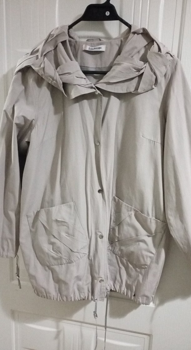 Bej renkli keten ceket, düğmeli, uzun kollu ve bol kesim. Notlu yaka ve cep detayları vardır, günlük kullanım için uygundur.