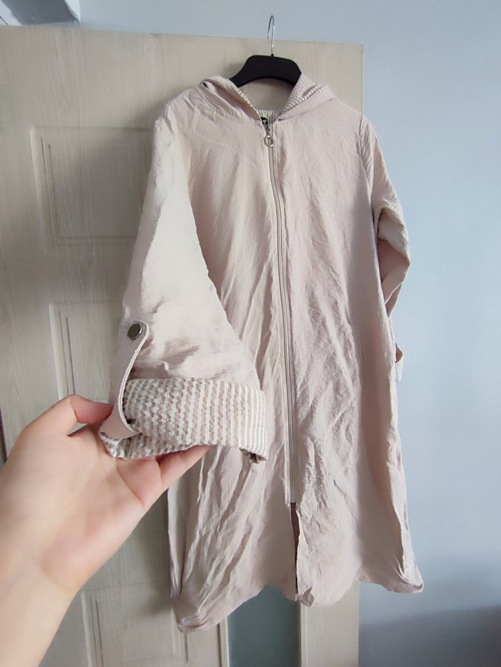 Bej renkli, keten kumaştan, uzun kollu ve yüksek yakalı bol kesim ceket. Fermuarlı ve minimal normcore tarzda, günlük kullanıma uygun.