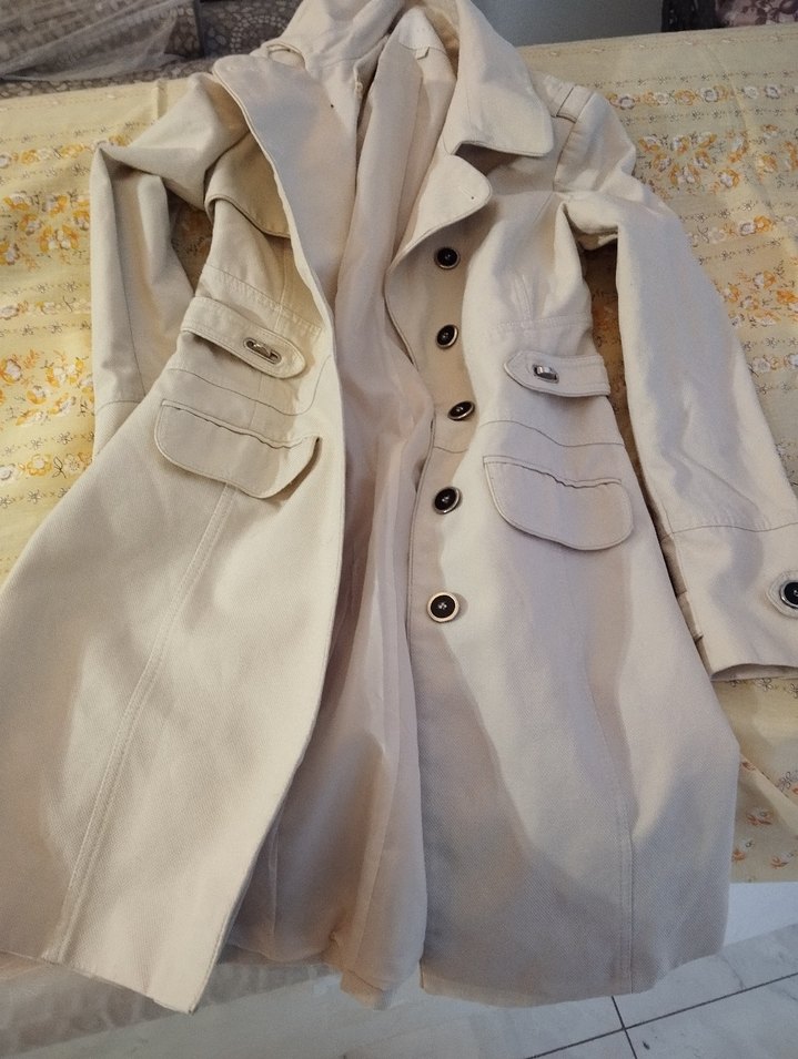 Bej keten kumaştan yapılmış, düğmeli ve normal boy midi trençkot. Notlu yakası ve uzun kolları ile günlük şık sokak stiline uygundur. KOTON M beden sanırım bedeni tam gözükmüyor m s beden olanlar giyebilir.