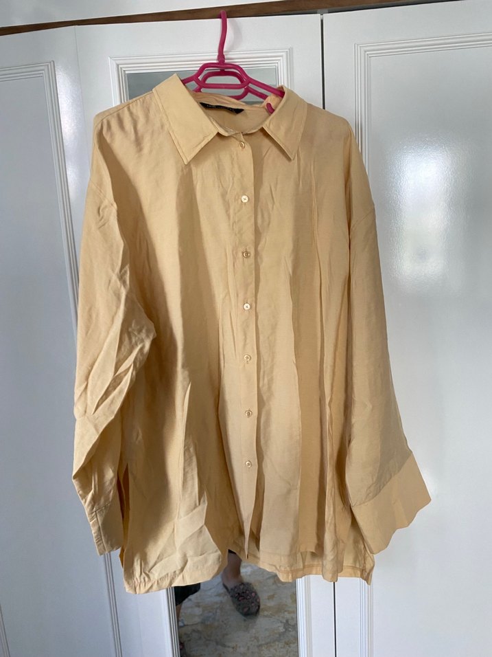 Bej keten gömlek, salaş kesim, düğmeli, uzun kollu ve yakalı. Normal midi boyda, sade ve vintage tarz, ofis için uygun.