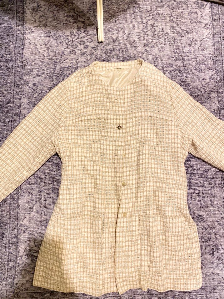 Bej renkli, keten kumaştan midi boy kadın ceket, uzun kollu ve düğmeli. Notched lapel yakaya sahip, bol kesim ve gündelik kullanıma uygun rahat stil sunar.