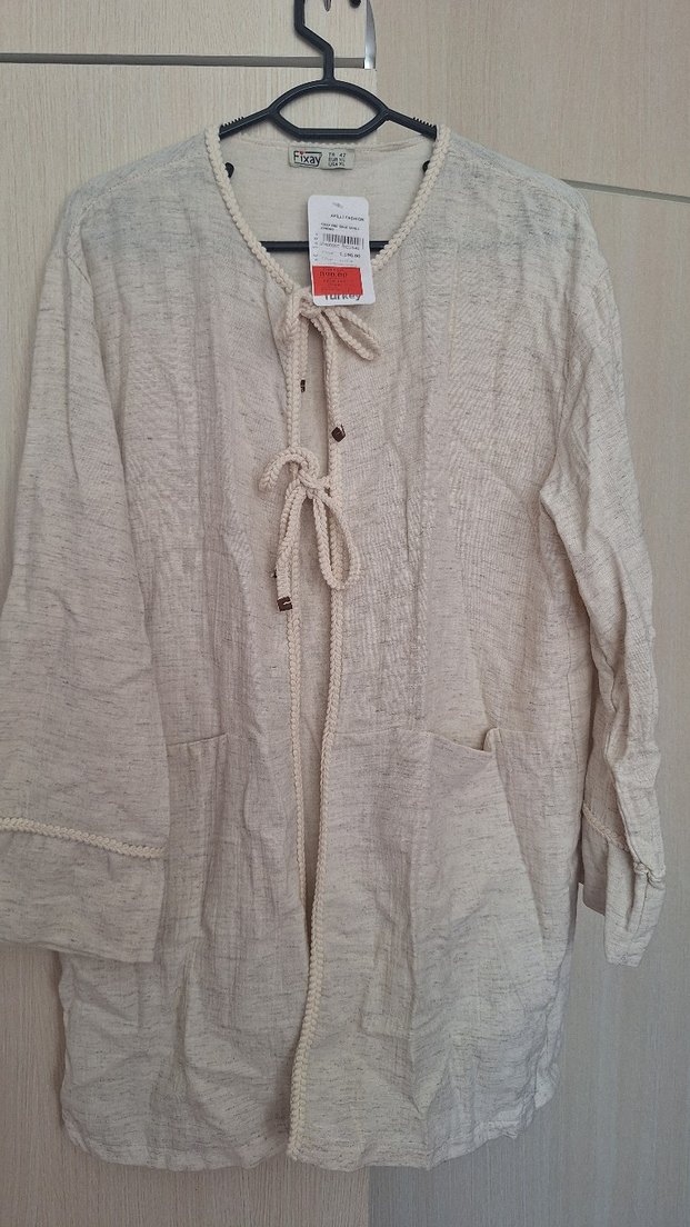 Uzun kollu, düğmeli, keten kumaştan bej renkte, bol kesim midi uzunlukta kadın ceket. Bohem tarzda, günlük kullanım için uygun. marka temsili