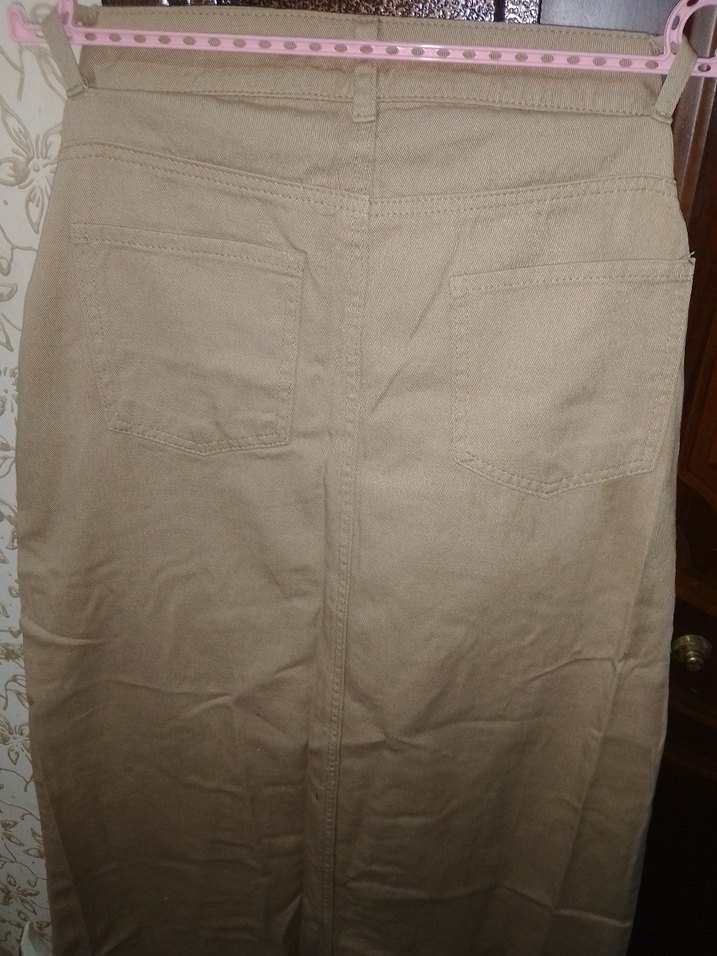 Bej renkte, keten kumaştan yapılmış, diz boyu ve vücuda oturan kesime sahip sade kadın eteği. Günlük kullanım için uygundur.