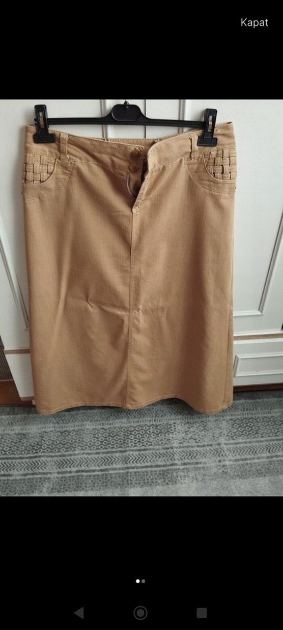 Bej renkte, keten kumaştan, belden kemerli ve örme cepli midi uzunlukta kadın eteği. Rahat kesimiyle ofis stiline uygundur.