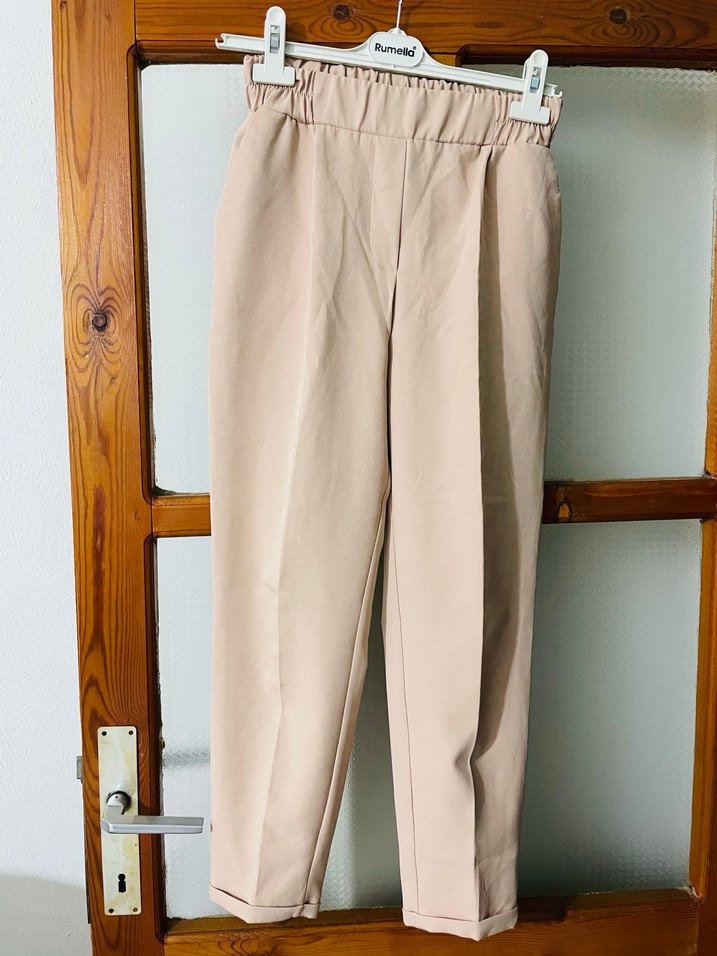 Bej midi keten kumaştan, regular fit ve lastikli bel detaylı kadın pantolonu, günlük kullanım için zahmetsiz şıklık sunar. ✨