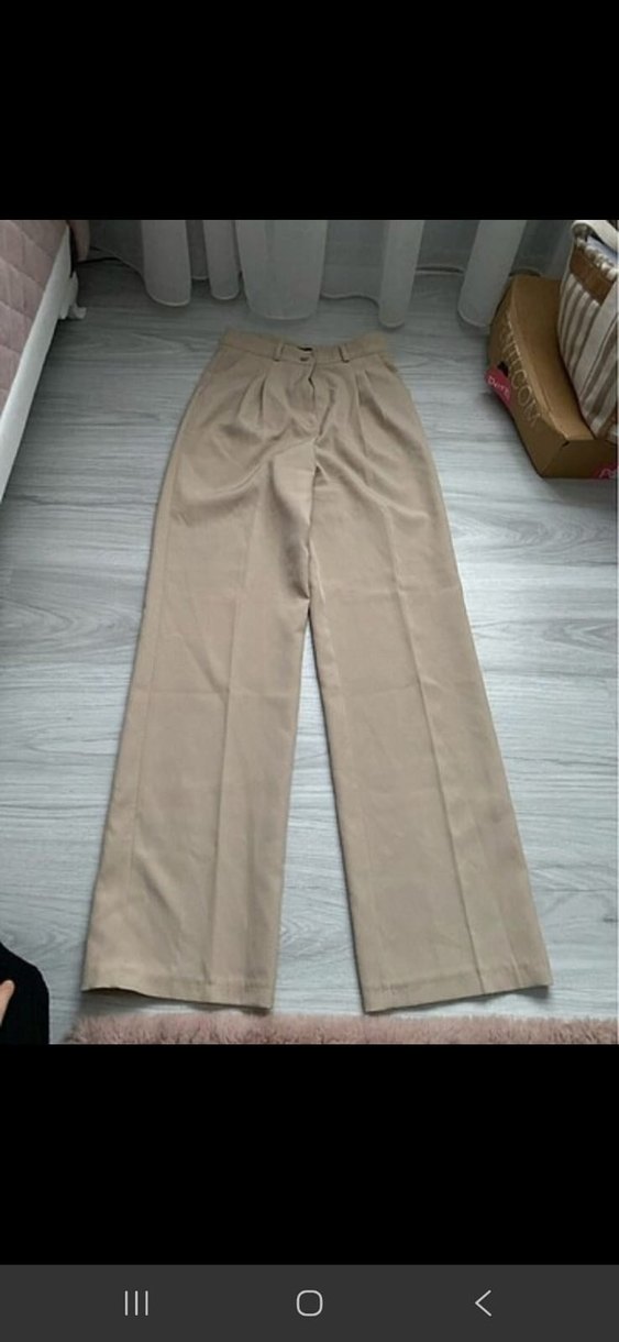 Bej renkli, keten kumaştan yapılmış, midi boy, düz kesim kadın kumaş pantolon. Ofis için uygun, sade ve normcore tarzda.