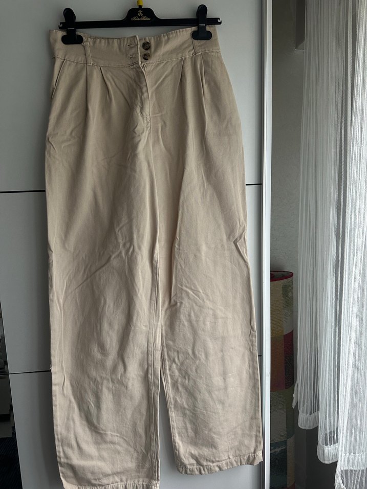 Yumuşak keten kumaştan, bej renkte, midi boy ve bol kesim kadın pantolon. Minimalist, desen içermeyen tasarımı günlük kullanıma uygundur.