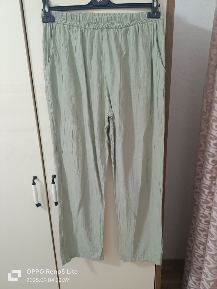Yumuşak keten kumaştan, bol kesim, pile detaylı bej midi uzunlukta kadın pantolon, günlük rahatlık ve minimalist stil için uygundur.