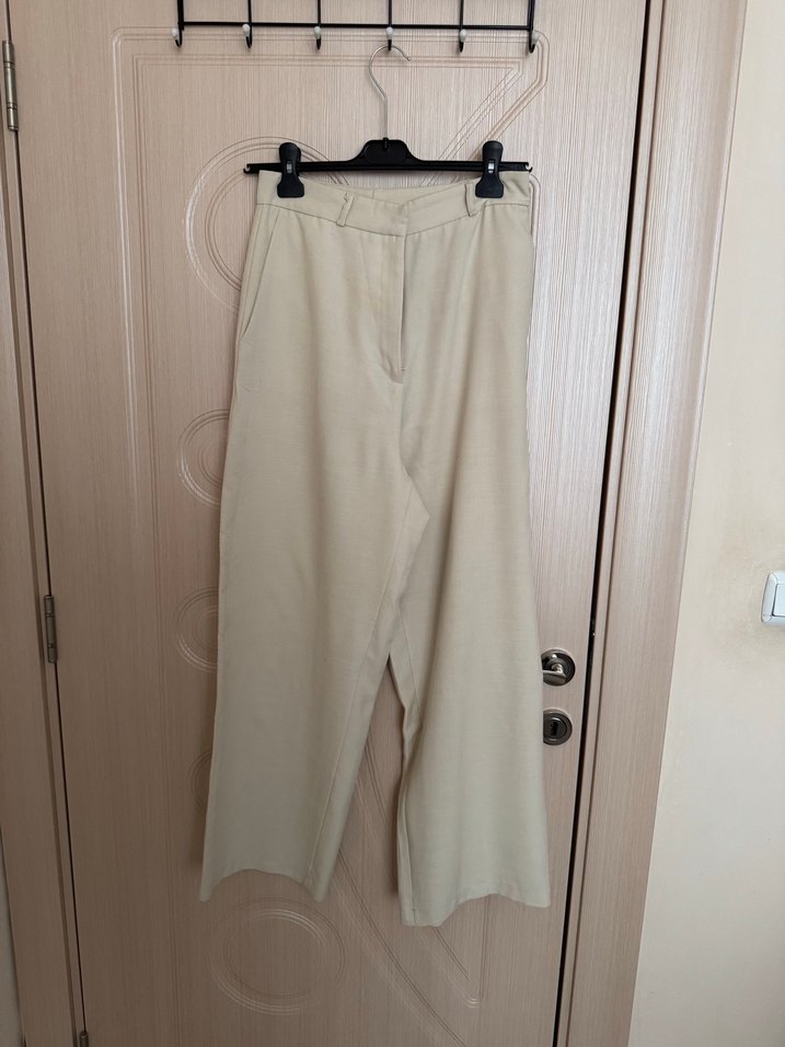 Bej renkli keten kumaştan, midi boyda, regular fit kadın pantolon. Minimalist sokak stiliyle günlük kullanıma uygun, zahmetsiz şıklık sunar.